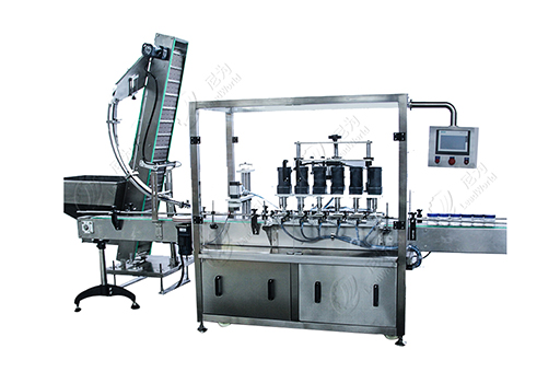 自動提升上蓋、旋蓋,瓶子直線進入,連續旋蓋,速度快,穩定。